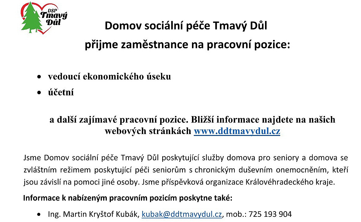 Domov sociální péče Tmavý Důl přijme zaměstnance na pracovní pozice: vedoucí ekonomického úseku a účetní. Nabízeny jsou i další zajímavé pracovní pozice.