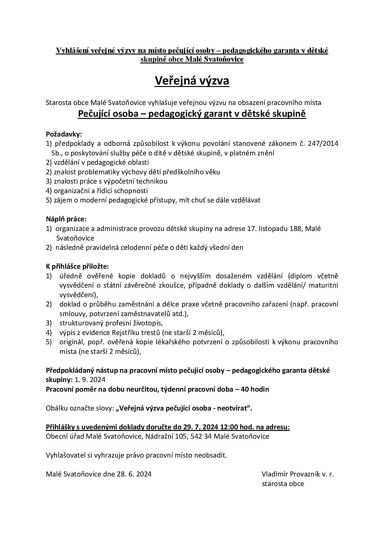 Starosta obce Malé Svatoňovice vyhlašuje veřejnou výzvu na obsazení pracovního místa Pečující osoba - pedagogický garant v dětské skupině obce Malé Svatoňovice.