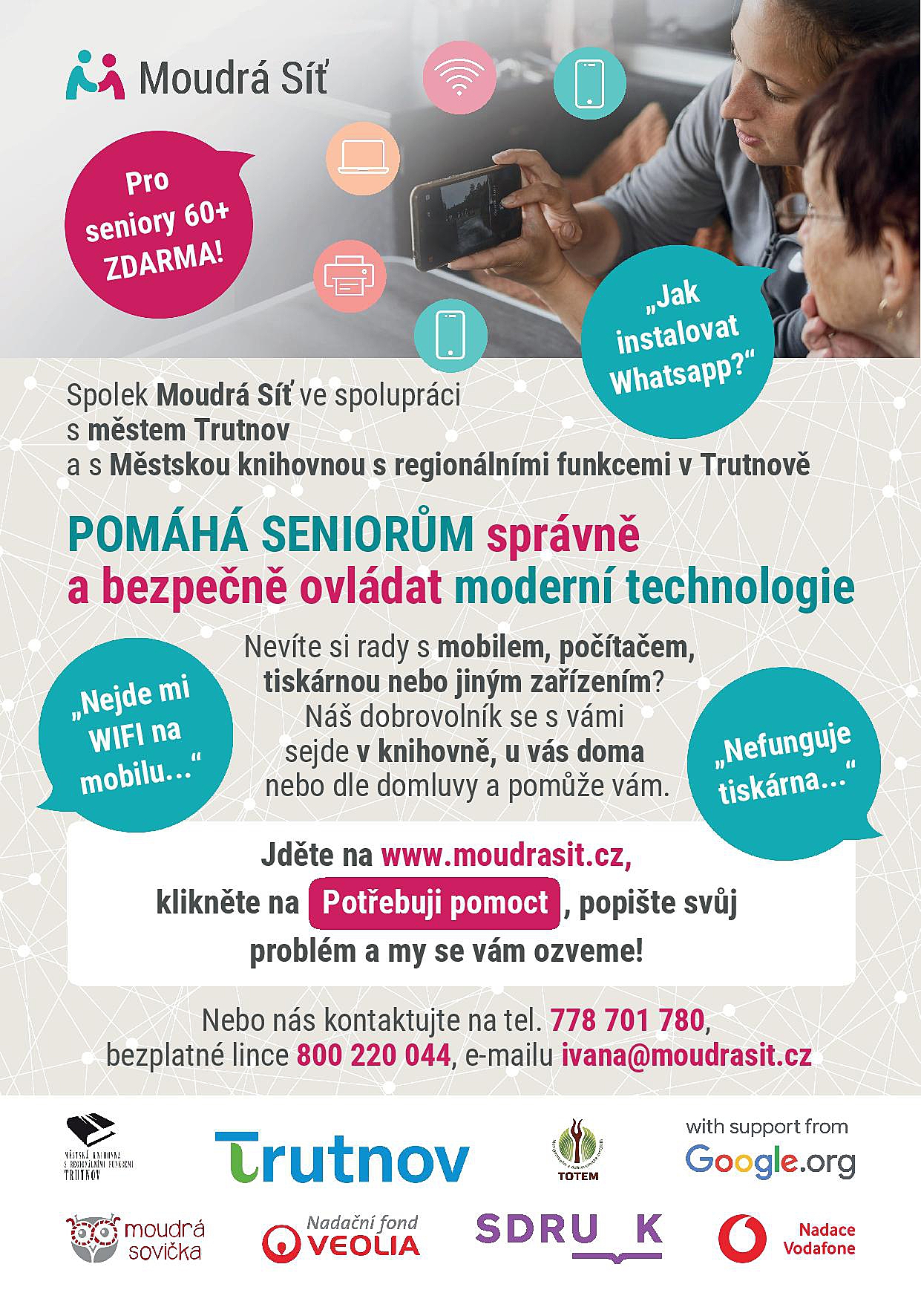 Moudrá Síť z.s. ve spolupráci s Městským úřadem Trutnov a Městskou knihovnou s regionálními funkcemi v Trutnově nabízí pomoc seniorům s ovládáním chytrého telefonu, tabletu, počítače, notebooku či jiného zařízení formou individuální konzultace s digitálním asistentem. Konzultace může proběhnout v knihovně, u seniora doma, telefonicky, nebo online. Digitální asistenti jsou akreditovaní dobrovolníci, zejména studenti středních a vysokých škol, kteří ve svém volném čase pomáhají seniorům s ovládáním nových technologií.
