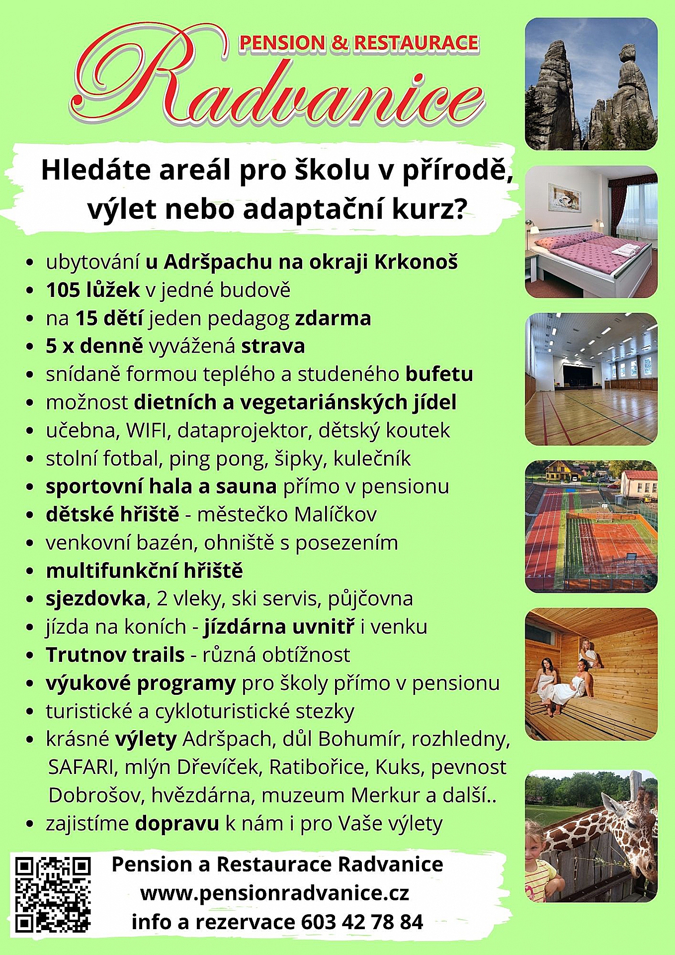 Pension a restaurace v Radvanicích bude také ve čtvrtek 10. října 2024 hostit konferenci Vzdělávání na Trutnovsku, kterou bude opět pořádat realizační tým projektu Místní akční plán (MAP) Trutnovsko IV.