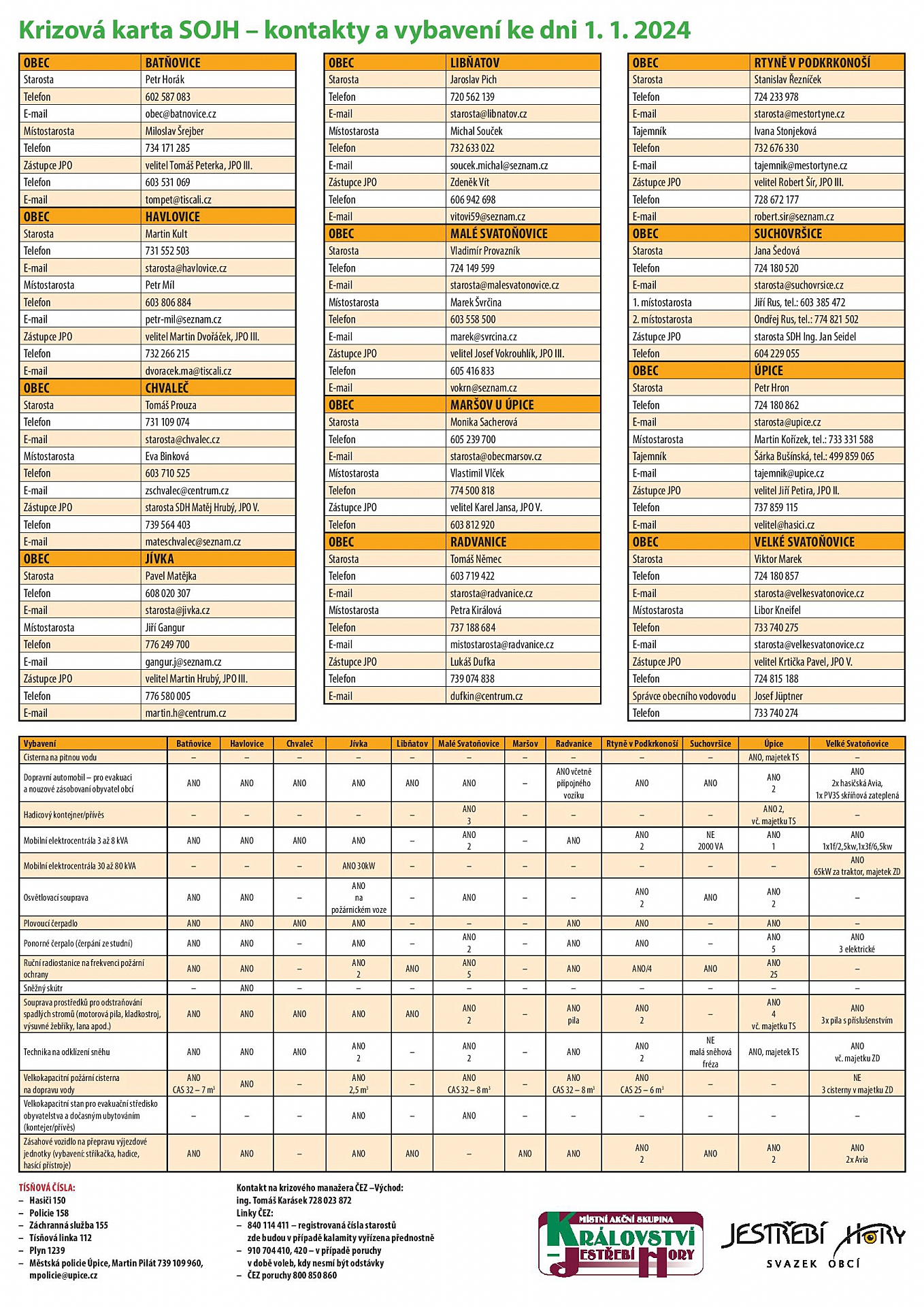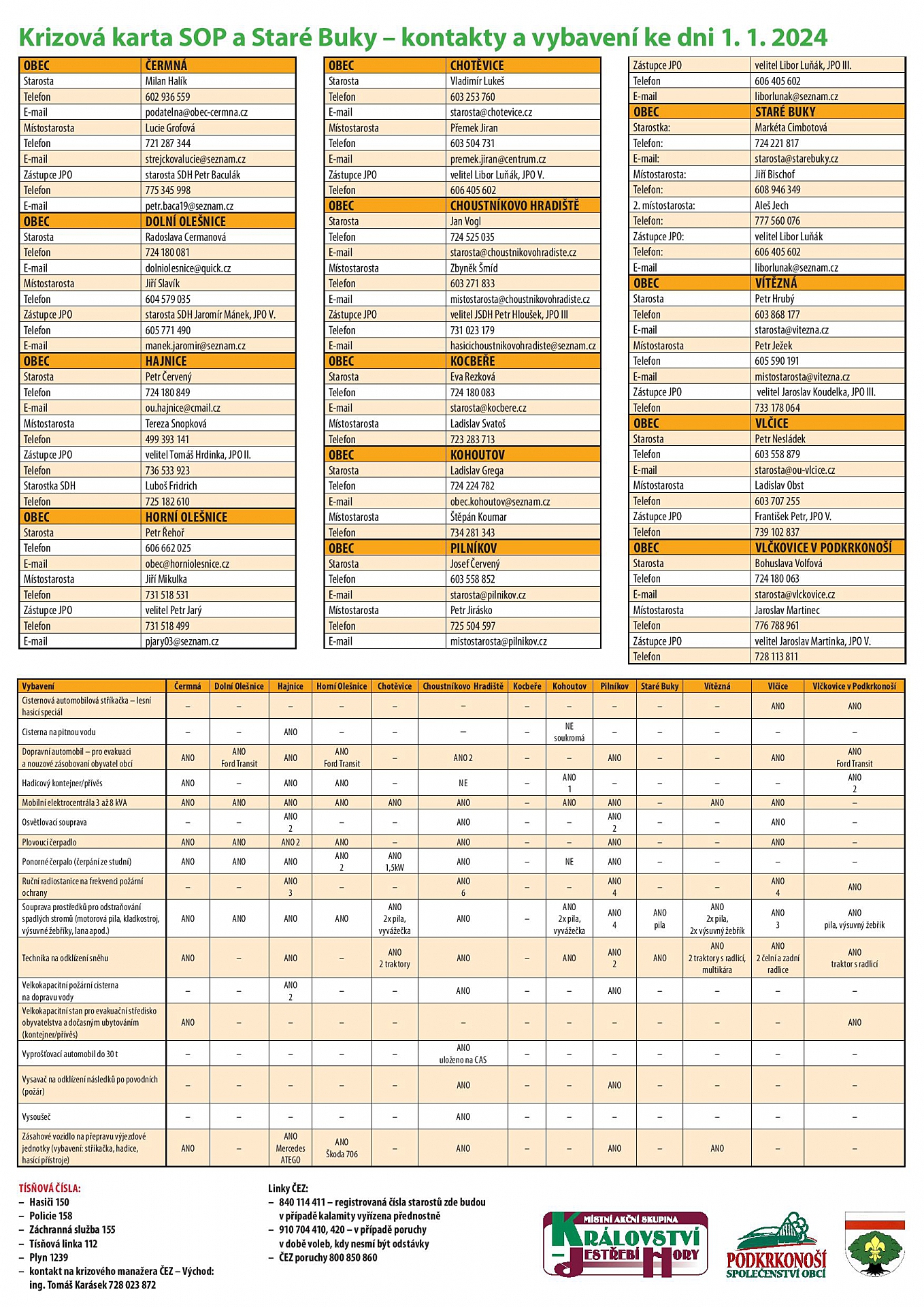 Místní akční skupina Království - Jestřebí hory, o. p. s. koordinuje Krizovou kartu, kde je uvedeno aktuální vybavení jednotlivých obcí.