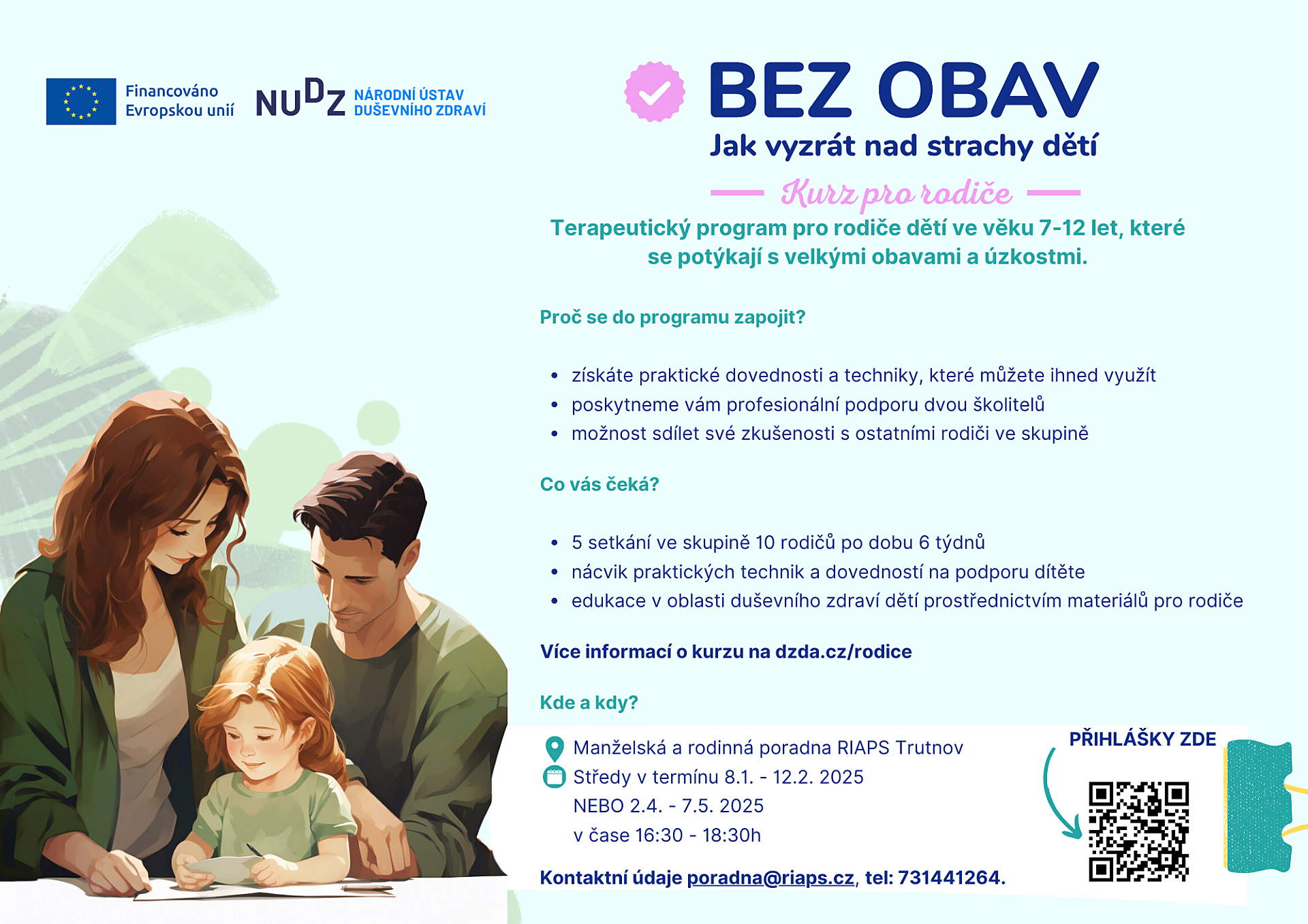 Nabídka možnosti vstupu do programu Bez obav, který je určen rodičům dětí (věk 7-12 let) s projevy úzkosti.