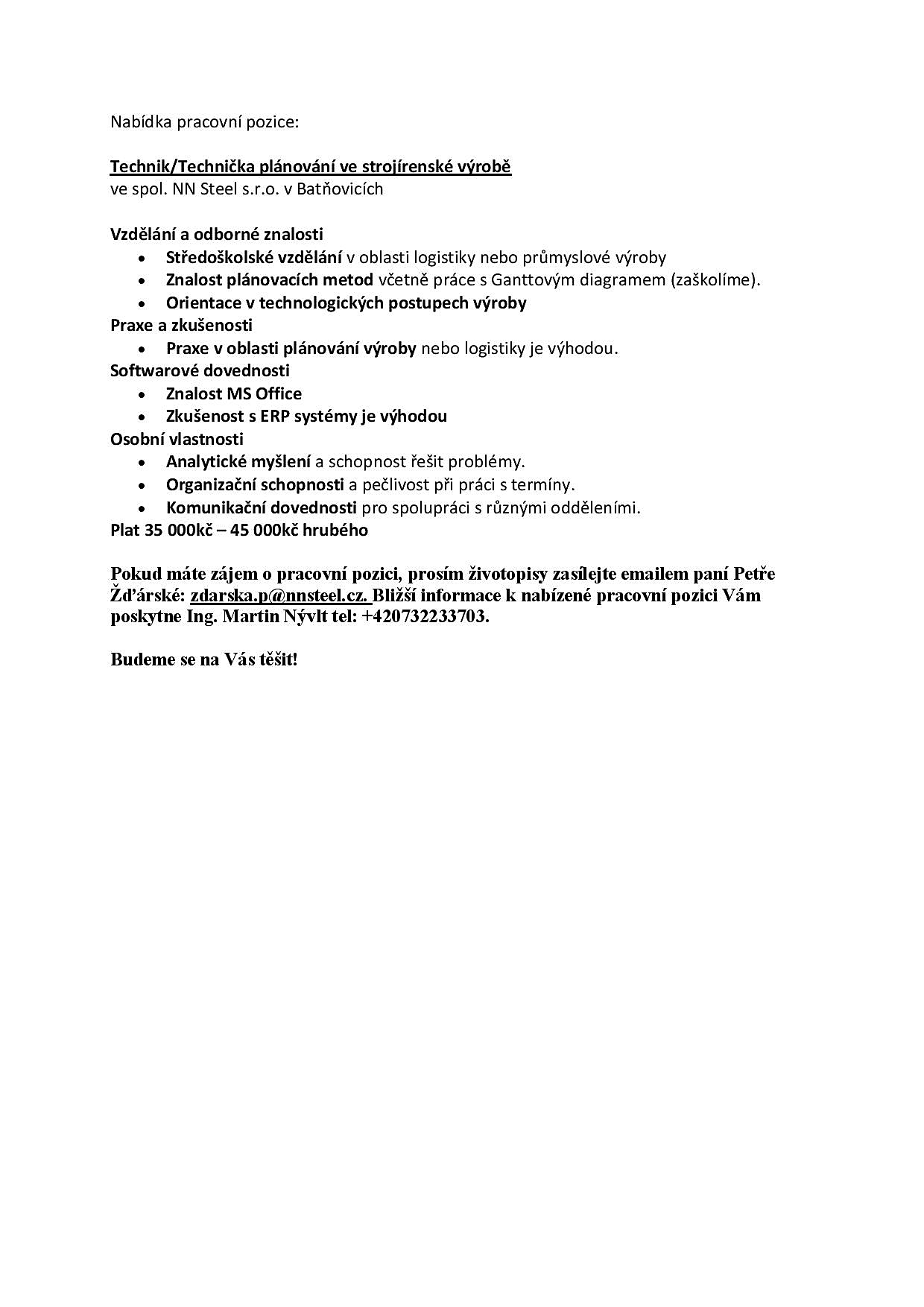NN Steel s.r.o. v Batňovicích rozšiřuje tým a hledá TECHNIKA NEBO TECHNIČKU PLÁNOVÁNÍ do strojírenské výroby.