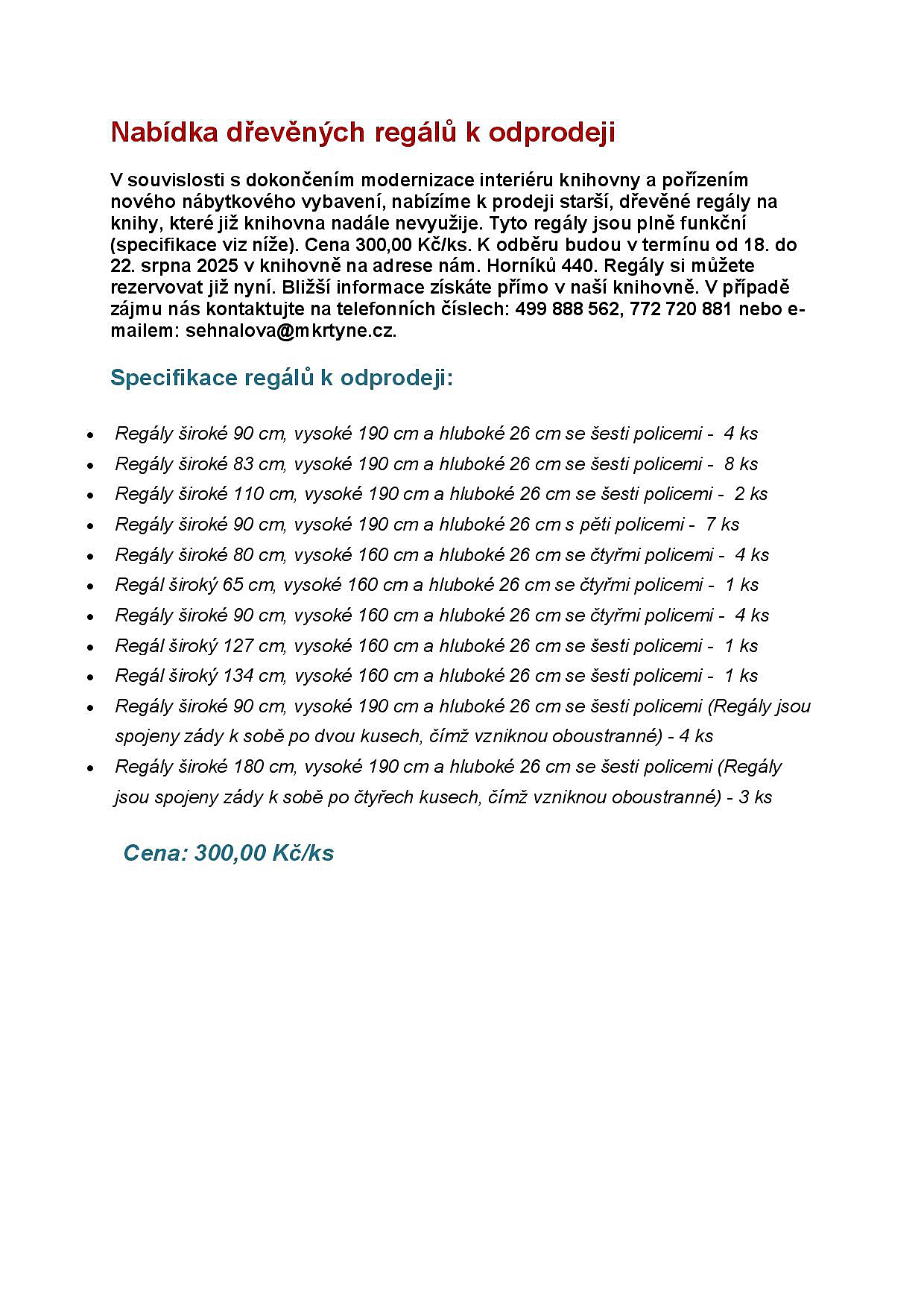 K odběru budou v termínu od 18. do 22. srpna 2025 v knihovně na adrese nám. Horníků 440. Regály si můžete rezervovat již nyní. Bližší informace získáte přímo v knihovně. V případě zájmu nás kontaktujte na telefonních číslech: 499 888 562, 772 720 881 nebo e-mailem: sehnalova@mkrtyne.cz.