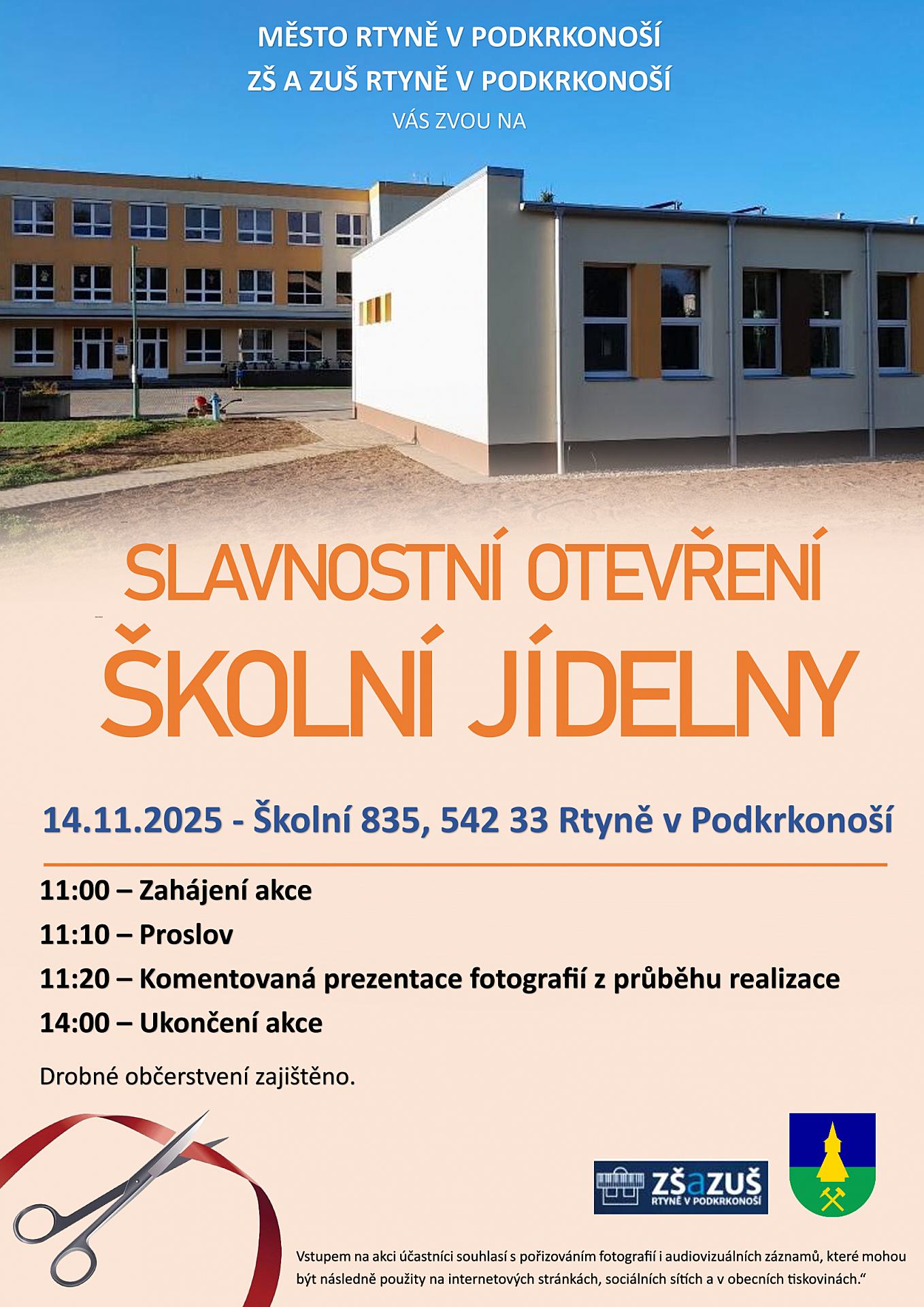 Město Rtyně v Podkrkonoší a ZŠ a ZUŠ Rtyně v Podkrkonoší srdečně zvou širokou veřejnost na slavnostní otevření nové školní jídelny, které se uskuteční v pátek 14. listopadu 2025