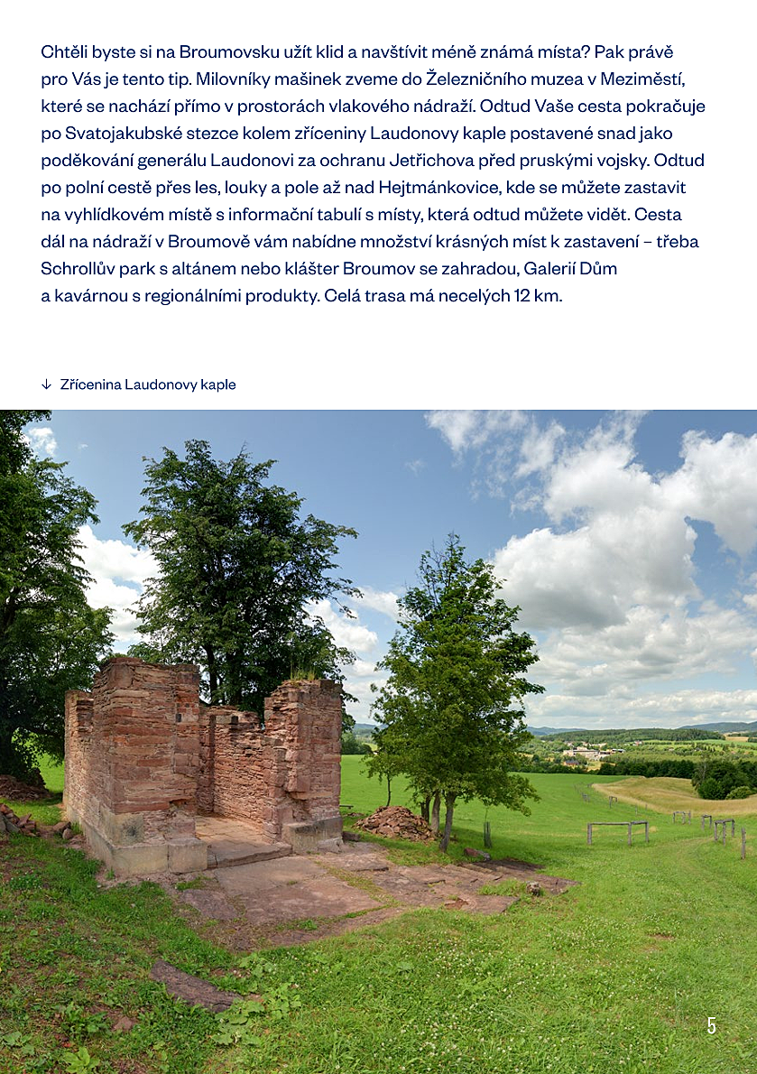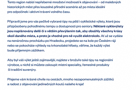Nezapomeňte si s sebou vzít dobrou náladu a pohodlnou obuv. Výlety jsou navrženy tak, aby byly příjemné pro každého, kdo má chuť objevovat poklady, které máme přímo za humny.