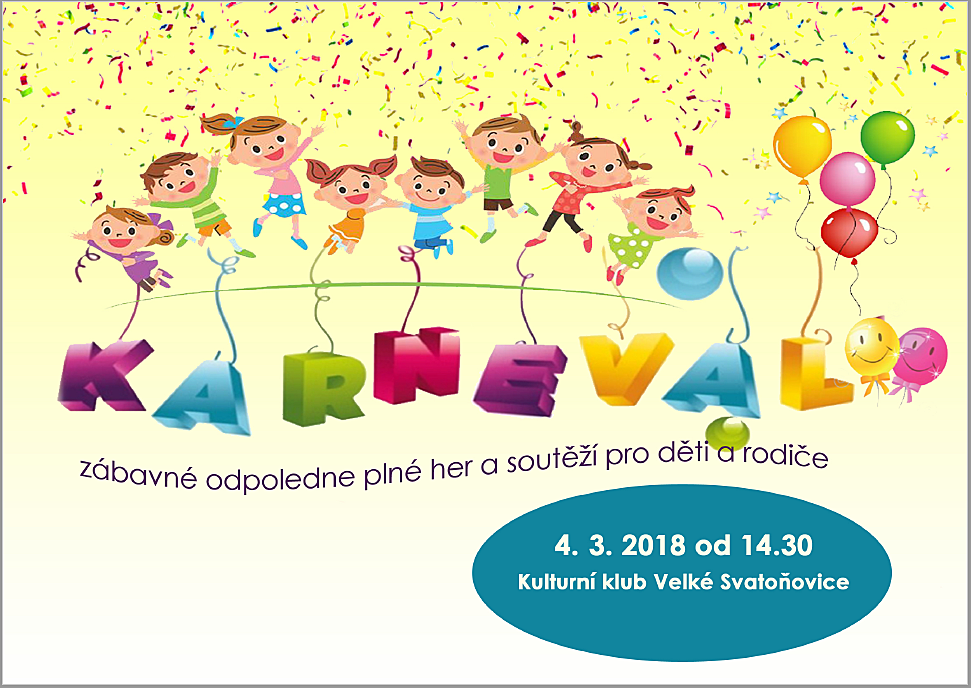 V neděli 4. března 2018 se v Kulturním klubu ve Velkých Svatoňovicích koná karneval. Zábavné odpoledne plné soutěží a her bude připraveno pro děti i rodiče. Hezkou zábavu!