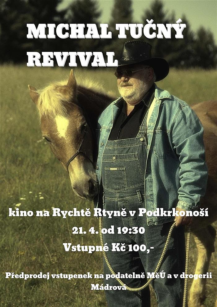 Jste srdečně zváni na koncert kapely Michal Tučný Revival, který se koná v sobotu 21. 4. 2018 od 19:30 ve Rtyni v Podkrkonoší v kině na Rychtě. Předprodej vstupenek na podatelně MěÚ a v drogerii Mádrová.
