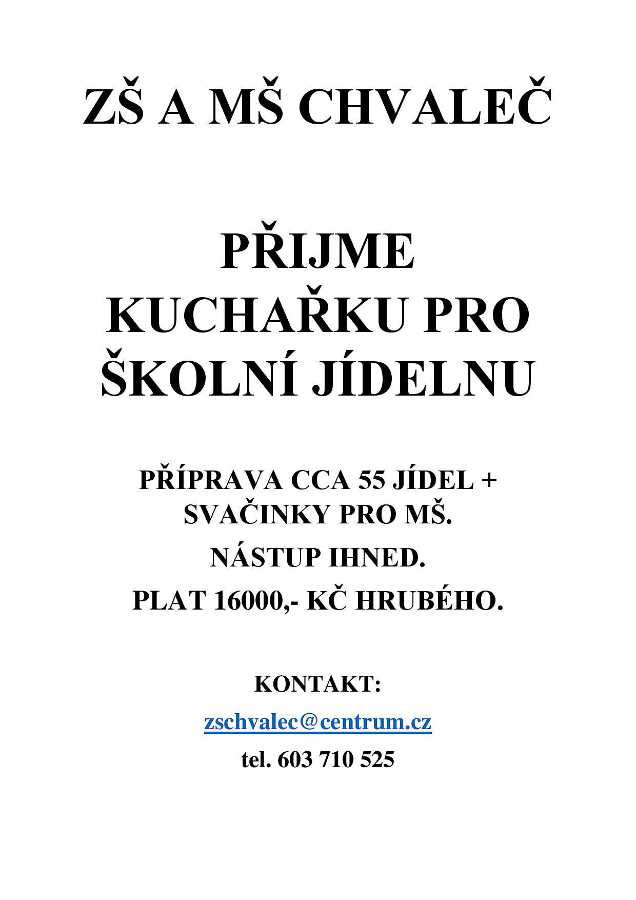 Příprava cca 55 jídel + svačinky pro MŠ. Plat 16 000 Kč hrubého. Nástup možný ihned. Životopisy posílejte na e-mail: zschvalec@centrum.cz.