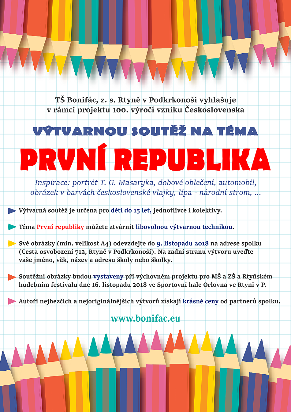 TŠ Bonifác, z. s. Rtyně v Podkrkonoší vyhlašuje v rámci projektu 100. výročí vzniku Československa výtvarnou soutěž na téma První republika. Více informací na plakátu.