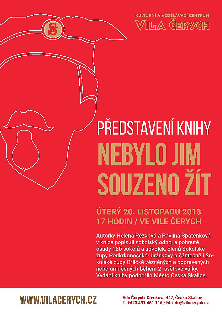 Přijměte pozvání na besedu o knize Nebylo jim souzeno žít, jejíž představení se uskuteční v úterý 20. 11. 2018 od 17:00 hodin ve vile Čerych v České Skalici. Autorky Helena Rezková a Pavlína Špatenková v knize popisují sokolský odboj a pohnuté osudy 160 sokolů a sokolek. Vydání knihy podpořilo město Česká Skalice.
