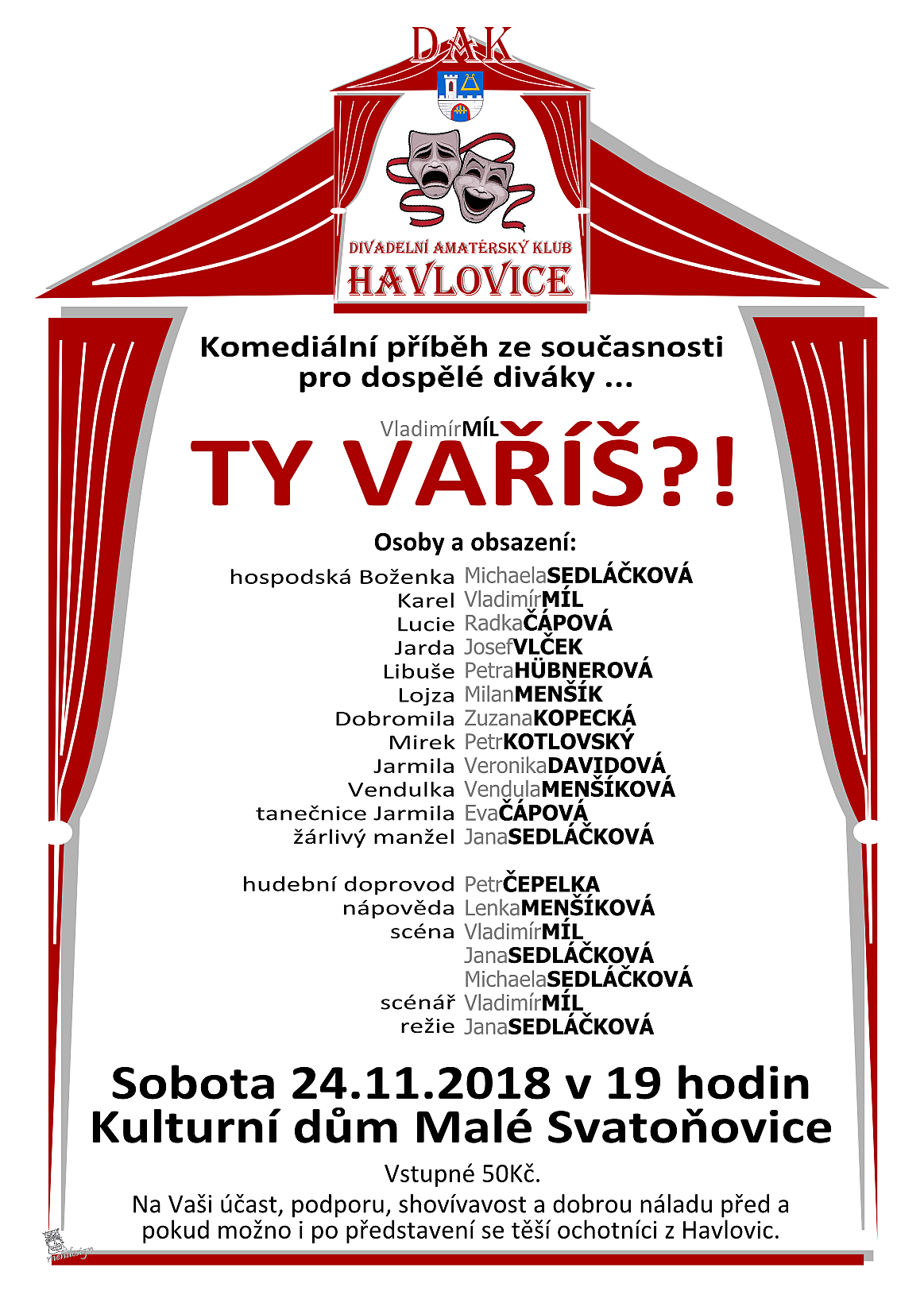 Divadelní amatérský klub Havlovice uvádí komediální příběh ze současnosti TY VAŘÍŠ?! Sobota 24. 11. 2018 v 19:00 hodin, Kulturní klub Malé Svatoňovice. Vstupné 50 Kč