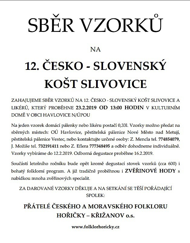 Oznamujeme, že byl zahájen sběr vzorků na 12. česko - slovenský košt slivovice a likérů, který proběhne 23. 2. 2019 od 13:00 hodin v kulturním domě v Havlovicích. Na jeden vzorek domácí pálenky nebo likéru postačí 0,33l. Dále na lístečku uveďte jméno, příjmení, bydliště (Čechy, Morava, Slovensko), druh ovoce, rok naložení ovoce a na kolik procent je vypáleno. Sběrná místa a kontakty naleznete na plakátu.