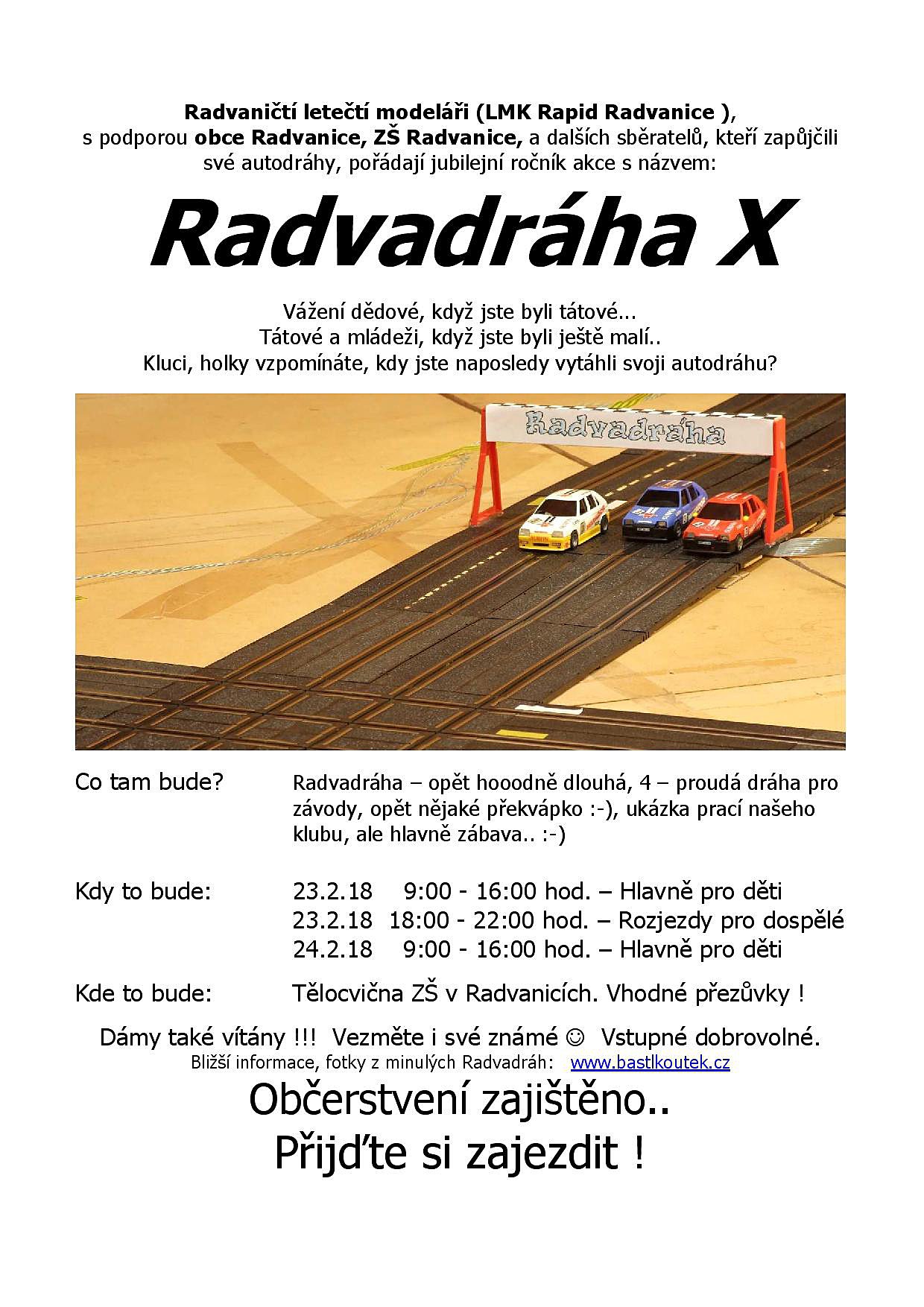 Od soboty 23. února 2019 od 9 hodin v tělocvičně ZŠ v Radvanicích se koná akce s názvem Radvadráha X. Občerstvení zajištěno. Na fotky z minulých let se můžete podívat zde. Více informací na plakátu.