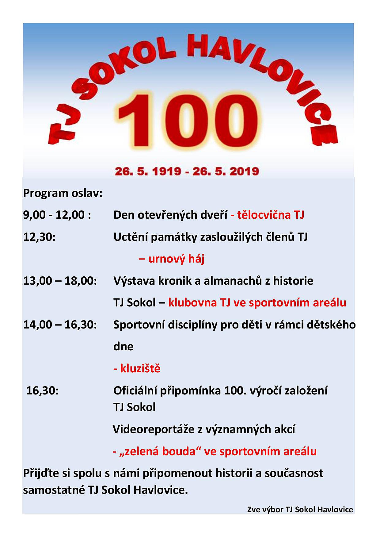 V neděli 26. 5. si připomeneme toto stoleté výročí. Zde (program) najdete program nedělních oslav. Nejprve si může veřejnost prohlédnout tělocvičnu TJ, poté si připomeneme významné osobnosti p. Lelkovou, p. Kuldu a p. Matysku. Odpoledne si mohou děti zasportovat, dospělí si prohlédnout kroniky TJ a turnaje HAPO. Od 16,30 oslavíme jubileum krátkým programem ve sportovním areálu. Přijďte si připomenout léta strávená v sokole.