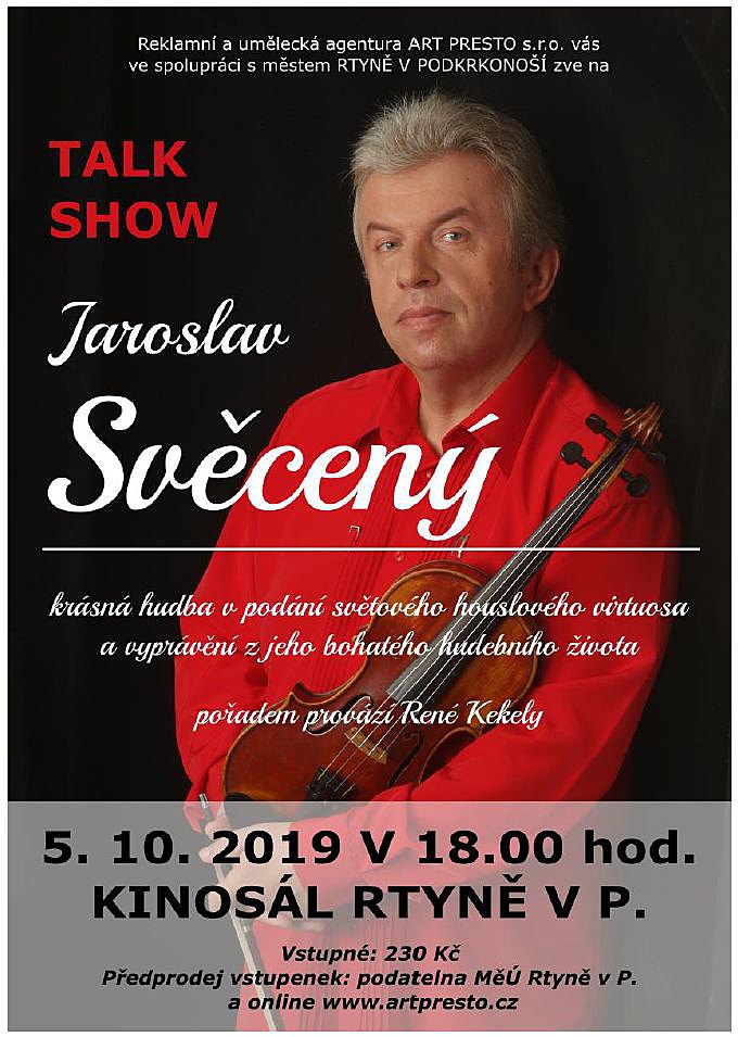Město Rtyně v Podkrkonoší a agentura ART PRESTO zvou na Talk show s Jaroslavem Svěceným. Krásná hudba v podání světového houslového viruosa s vyprávěním z jeho bohatého hudebního života. Pořadem provází René Kekely. Akce se koná v sobotu 5. října 2019 od 18:00 hodin v kinosále na Rychtě. Vstupenky za Kč 230,- lze zakoupit online na www.artpresto.cz a od pondělí 9. září 2019 na podatelně MěÚ ve Rtyni v Podkrkonoší.