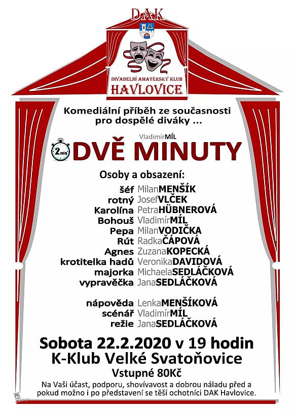 V sobotu 22.února od 19 hodin v K-Klubu Velké Svatoňovice předvede Divadelní amaterský klub Havlovice svůj um v komediálním příběhu ze současnosti s názvem "Dvě minuty".