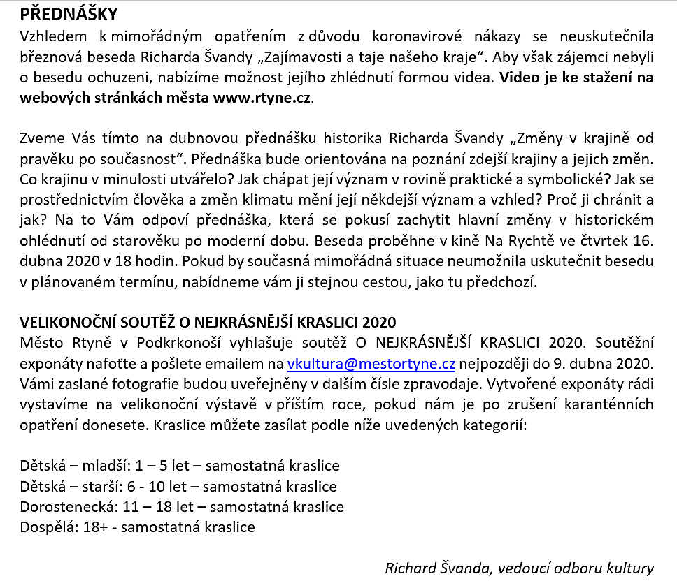 Vzhledem k mimořádným opatřením z důvodu koronavirové nákazy se neuskutečnila březnová beseda Richarda Švandy „Zajímavosti a taje našeho kraje“. Aby však zájemci nebyli o besedu ochuzeni, nabízíme možnost jejího zhlédnutí formou videa. Video je ke stažení na webových stránkách města www.rtyne.cz.