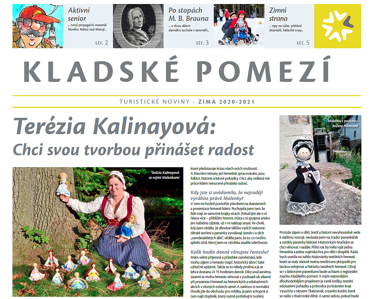 Na titulní stránce vás čeká rozhovor s Terézií Kalinayovou, jejíž originální ručně vyráběné panenky z přírodních materiálů, tzv. Malenky, se pyšní certifikací Regionální produkt Kladského pomezí. Dále se dozvíte o probíhající veřejné sbírce na obnovu Jiráskovy chaty na Dobrošově. Tato téměř stoletá stavba od architekta Dušana Jurkoviče má před sebou zásadní rekonstrukci, která jí pomůže vdechnout nový život, zlepšit kvalitu ubytování a umožnit celoroční provoz. Vzniknout by měla i nová naučná stezka vedoucí z Nového Města nad Metují.