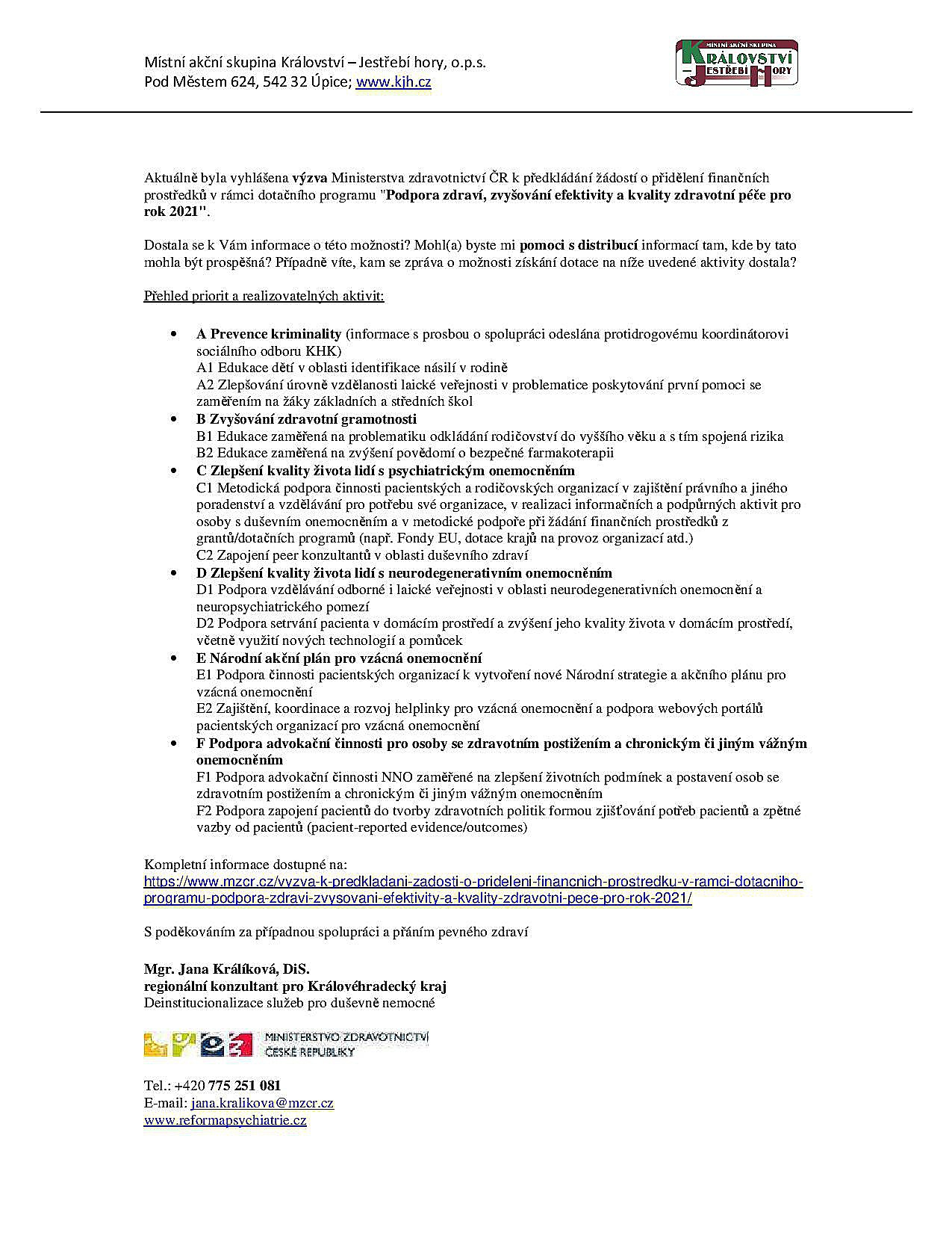 Aktuálně byla vyhlášena výzva Ministerstva zdravotnictví ČR k předkládání žádostí o přidělení finančních prostředků v rámci dotačního programu "Podpora zdraví, zvyšování efektivity a kvality zdravotní péče pro rok 2021". Dostala se k Vám informace o této možnosti? Mohl(a) byste mi pomoci s distribucí informací tam, kde by tato mohla být prospěšná? Případně víte, kam se zpráva o možnosti získání dotace na níže uvedené aktivity dostala? Více na přiloženém plakátě.