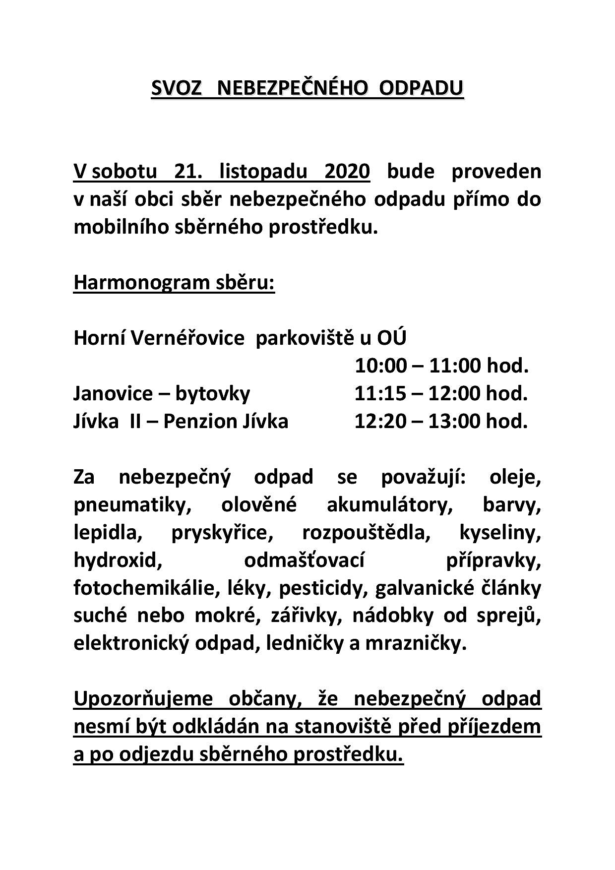 Nebezpečný odpad se odevzdává ve sběrných dvorech nebo při mobilním sběru. Jedná se např. o barvy, lepidla, rozpouštědla, oleje, kyseliny, léky a domácí chemikálie, baterie a zářivky, elektrozařízení.