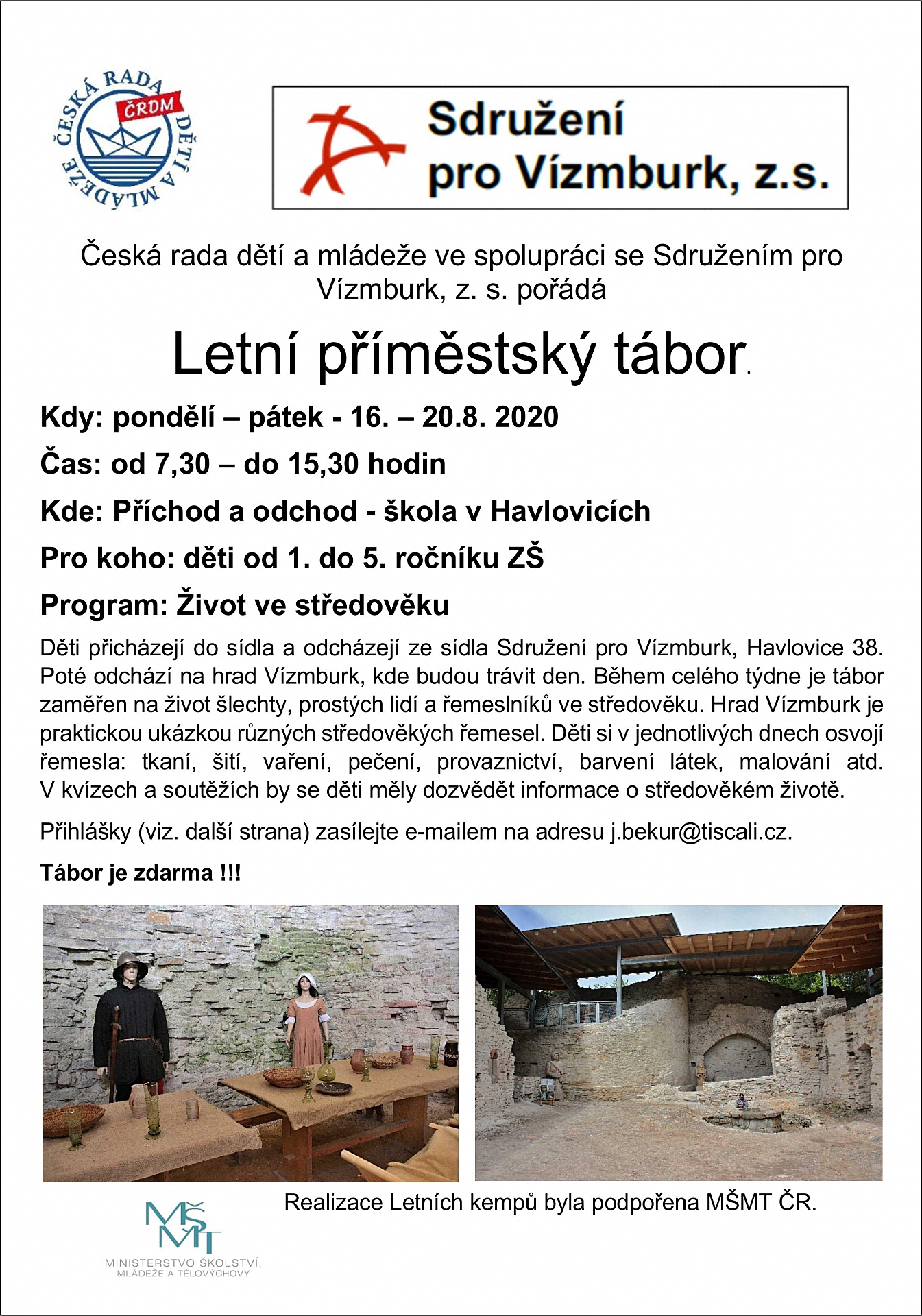 Na vědomost se dává, že od 16. do 20. srpna pořádá ČRDM společně s naším spolkem na Vízmburku tábor. Děti přijdou vždy v 7,30 hodin k havlovické škole. poté odejdeme na Vízmburk a v 15,30 hodin budou děti opět k vyzvednutí před školou. V přiloženém souboru se dozvíte víc. Třeba to, že tábor je pro děti od 1. do 5. ročníku zcela zdarma. Hlaste se co nejdříve na tel 777005790, kapacita je omezena. Více v přílohách.