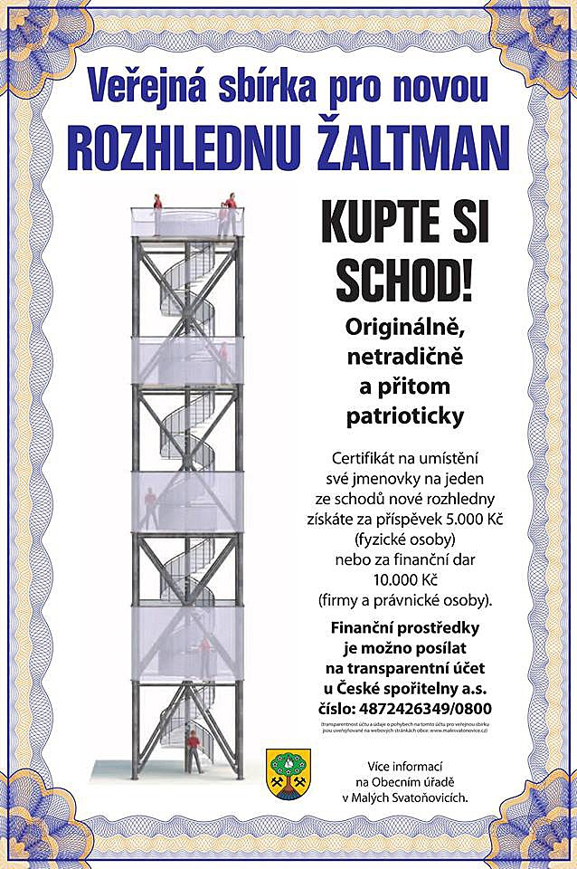 Na vědomost se dává, že probíhá veřejná sbírka pro novou rozhlednu Žaltman. Podpořte dobrou věc a kupte si schod! Vaše jméno tak nebude zapomenuto... Více informací na plakátu.
