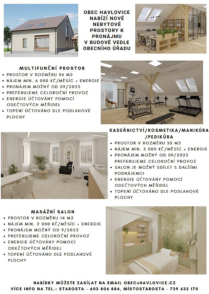 Obec Havlovice nabízí nebytové prostory k pronájmu v nově zrekonstruované budově přímo vedle obecního úřadu. Prohlídky možné po domluvě se starostou nebo místostarostou obce.
