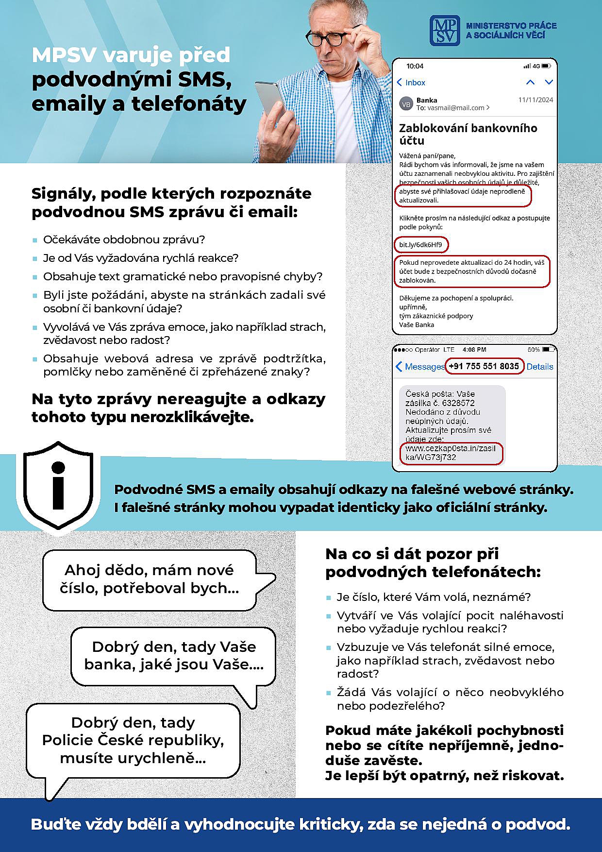 Ministerstvo práce a sociálních věcí varuje před podvodnými SMS, e-maily a telefonáty!