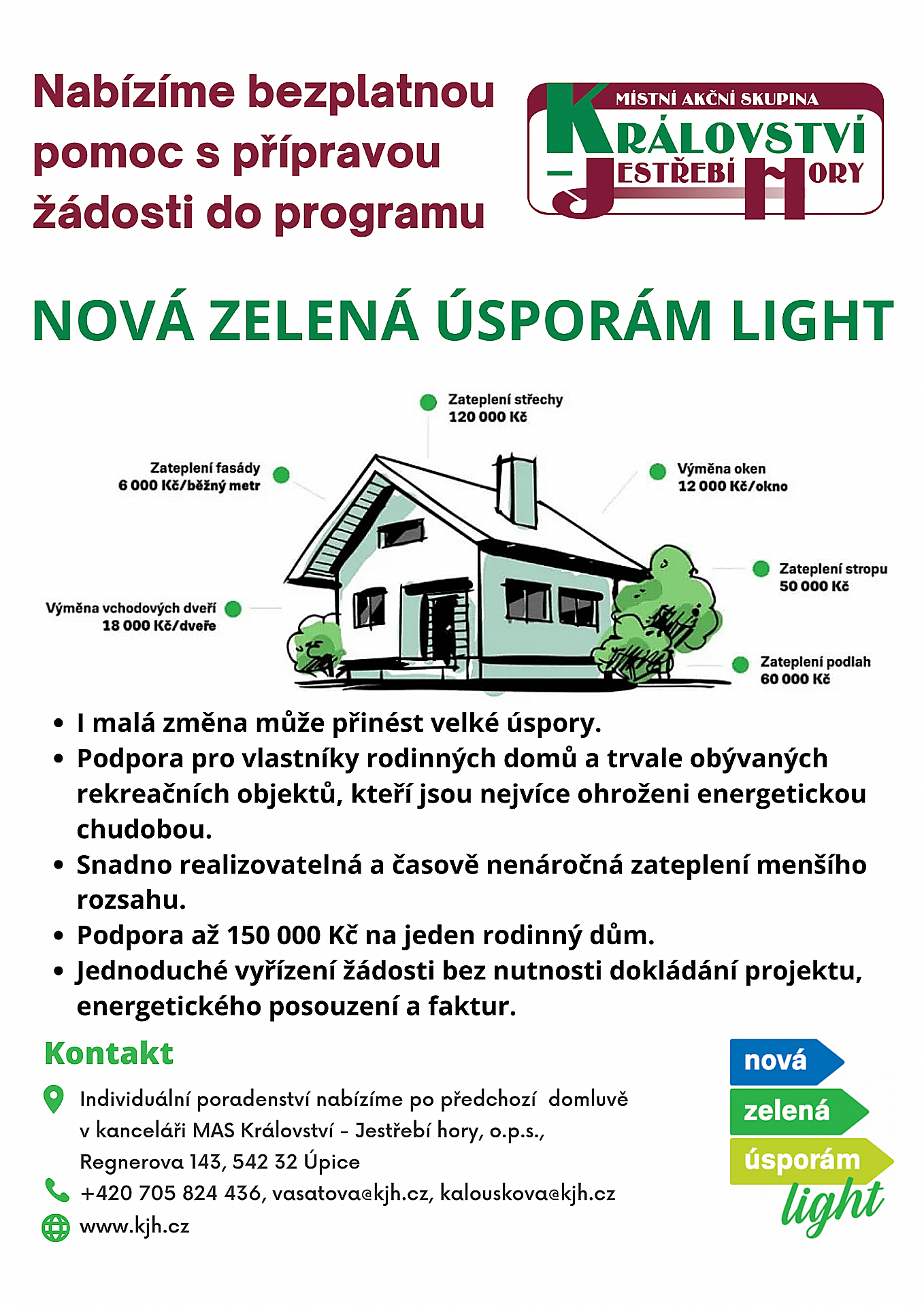 Dotační program Nová zelená úsporám (NZÚ) Light je reakcí na současnou energetickou krizi a extrémně vysoké ceny energií. Ministerstvo životního prostředí, Státní fond životního prostředí ČR a Ministerstvo práce a sociálních věcí nabízejí v rámci tohoto programu okamžitou finanční pomoc bez nutnosti vlastních vstupních investic. Žadatelům o uvedenou dotaci pomáhá Místní akční skupina Království – Jestřebí hory, o.p.s.