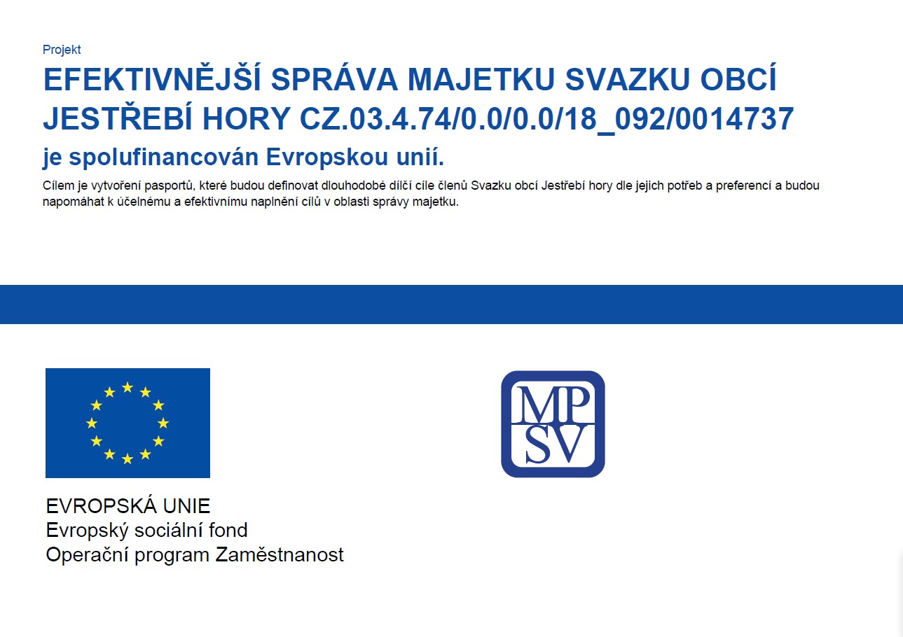 Svazek obcí Jestřebí hory získal prostřednictvím Ministerstva práce a sociálních věcí ČR dotaci na projekt pod názvem Efektivnější správa majetku Svazku obcí Jestřebí hory. Celkové předpokládané přímé i nepřímé náklady jsou ve výši 2.690.665,-Kč s DPH, kde 85 % finančních prostředků poskytne Evropská unie, 10 % bude ze státního rozpočtu a 5 % zaplatí Svazek obcí Jestřebí hory.