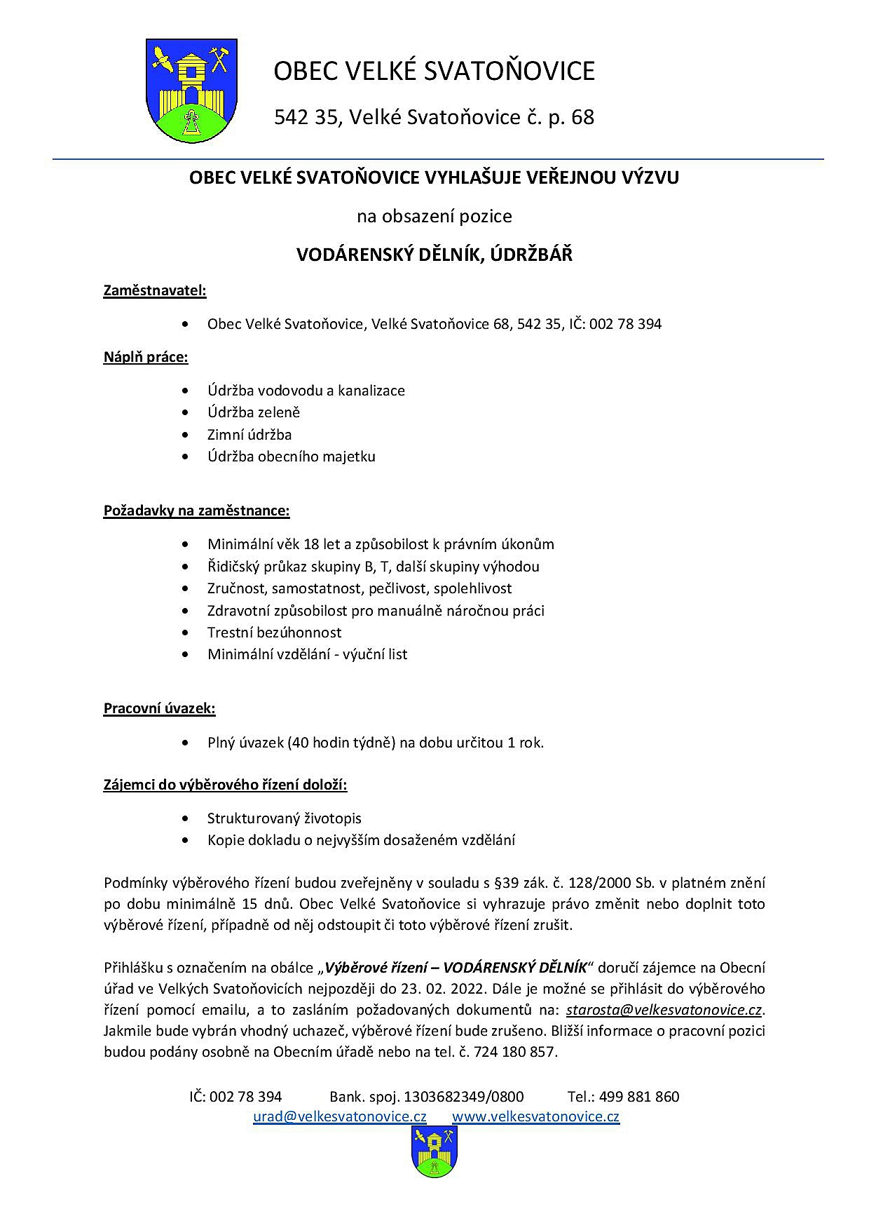 OBEC VELKÉ SVATOŇOVICE VYHLAŠUJE VEŘEJNOU VÝZVU na obsazení pozice VODÁRENSKÝ DĚLNÍK, ÚDRŽBÁŘ.